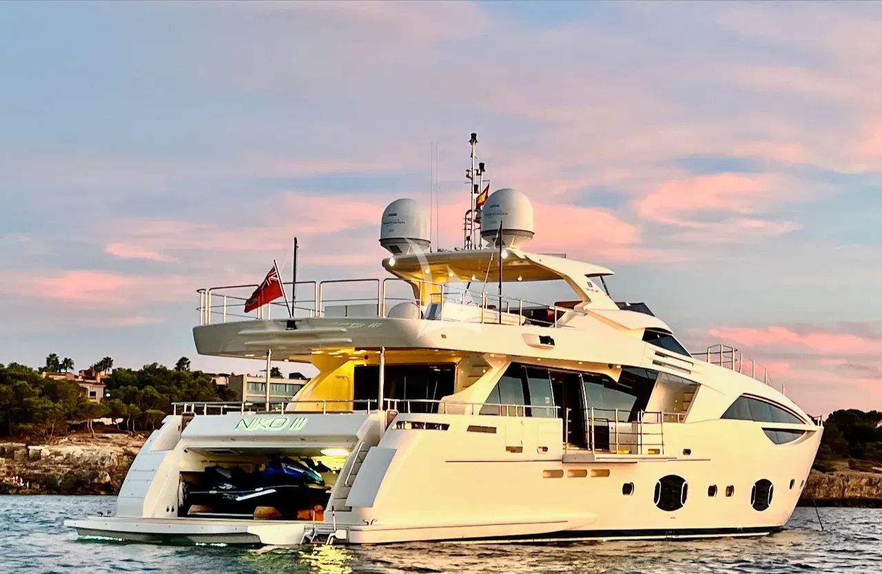 Step aboard the magnificent NIKO III, a 31-meter Custom Line masterpiece that epitomizes Italian craftsmanship and contemporary luxury. Built in 2012 and thoughtfully refitted in 2018, this stunning yacht showcases the renowned design expertise of Zuccon International, seamlessly blending sophisticated aesthetics with exceptional performance. Her semi-displacement hull delivers impressive cruising capabilities, achieving 16 knots comfortably with a range of 500 nautical miles, while advanced stabilization systems ensure supreme comfort both underway and at anchor. NIKO III accommodates up to 10 guests across five beautifully appointed cabins, including a main deck master suite and four additional staterooms on the lower deck, each featuring luxurious ensuite facilities. The yacht's impressive array of water toys transforms every charter into an adventure playground, featuring the latest 2025 eFoil, twin jet skis including a brand-new Kawasaki Ultra 310, paddle boards, wakeboard, and comprehensive snorkeling equipment for exploring the Mediterranean's pristine waters. Perfectly positioned to explore the enchanting Balearic Islands, NIKO III operates from Palma de Mallorca during summer months, offering privileged access to the glamorous beaches of Mallorca and the vibrant nightlife of Ibiza. Whether seeking thrilling water sports, secluded anchorages, or sophisticated marina dining, this exceptional yacht delivers an unforgettable charter experience where Italian elegance meets Mediterranean adventure.