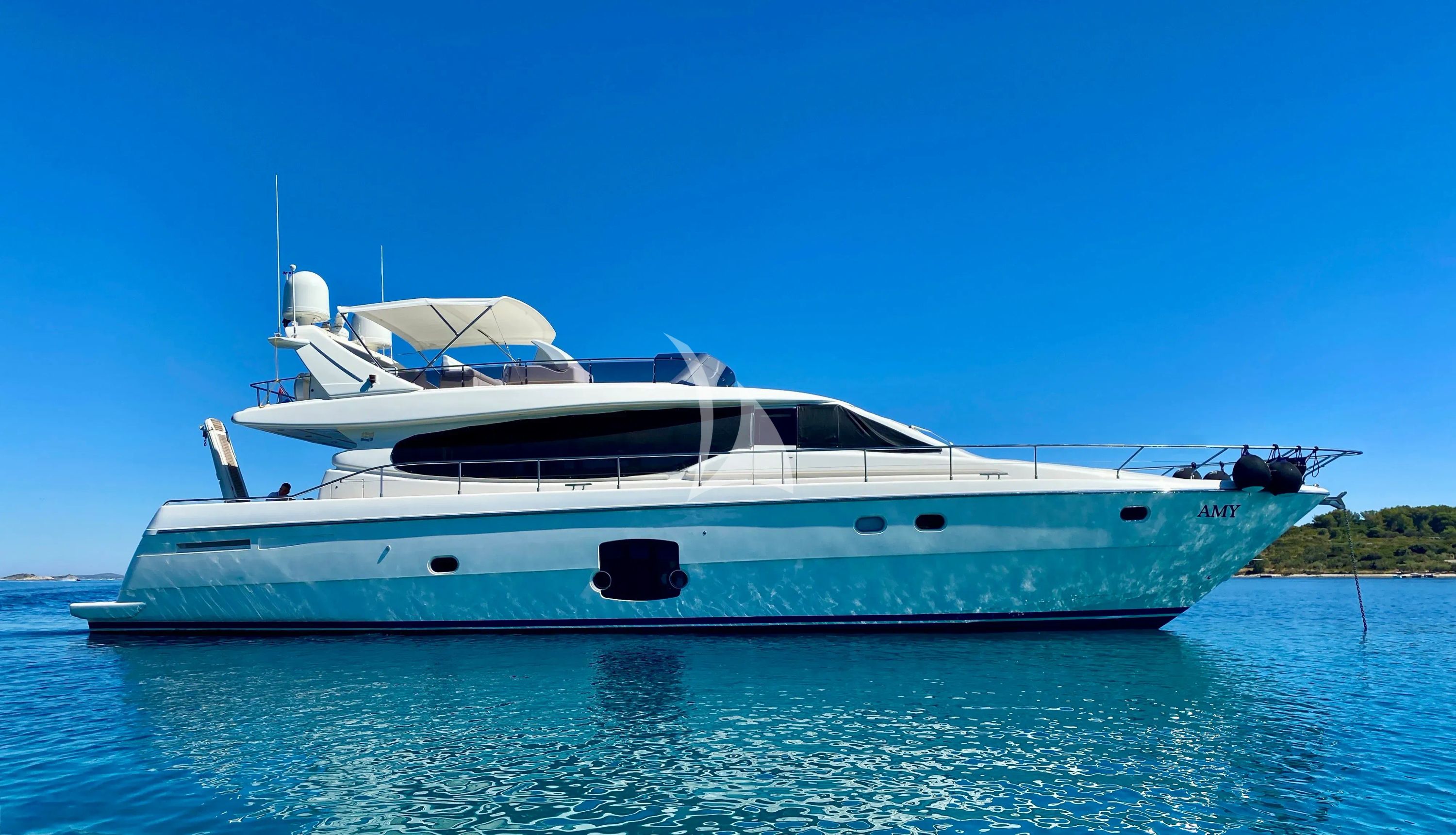 Discover the perfect blend of elegance and adventure aboard AMY, a meticulously maintained 20-meter Ferretti motor yacht that exemplifies Italian craftsmanship at its finest. Following her comprehensive 2019 refit, this sophisticated vessel offers an impeccable charter experience for up to six guests in three beautifully appointed cabins, including a generous master stateroom and flexible accommodation options that make her particularly well-suited for families and discerning groups. Based in the historic port of Trogir, Croatia, AMY provides unrivaled access to the stunning Dalmatian coast with its crystalline waters, secluded coves, and charming medieval towns. Her impressive collection of water toys transforms every anchorage into a private playground, featuring dual Seabobs, a cutting-edge Lampuga Jet Board, paddleboards, waterskis, and wakeboards. The high-performance Williams tender ensures seamless exploration of hidden beaches and coastal villages, while the yacht's efficient 22-knot cruising speed and 300-nautical-mile range open up endless possibilities along this UNESCO World Heritage coastline. AMY's thoughtfully designed layout maximizes both comfort and entertainment, with bright, airy interiors bathed in natural light and contemporary amenities including 5G connectivity, comprehensive entertainment systems, and full climate control. Whether seeking exhilarating water sports, cultural discoveries among ancient stone cities, or simply relaxing in sophisticated surroundings, AMY delivers an exceptional charter experience in one of the Mediterranean's most captivating destinations.