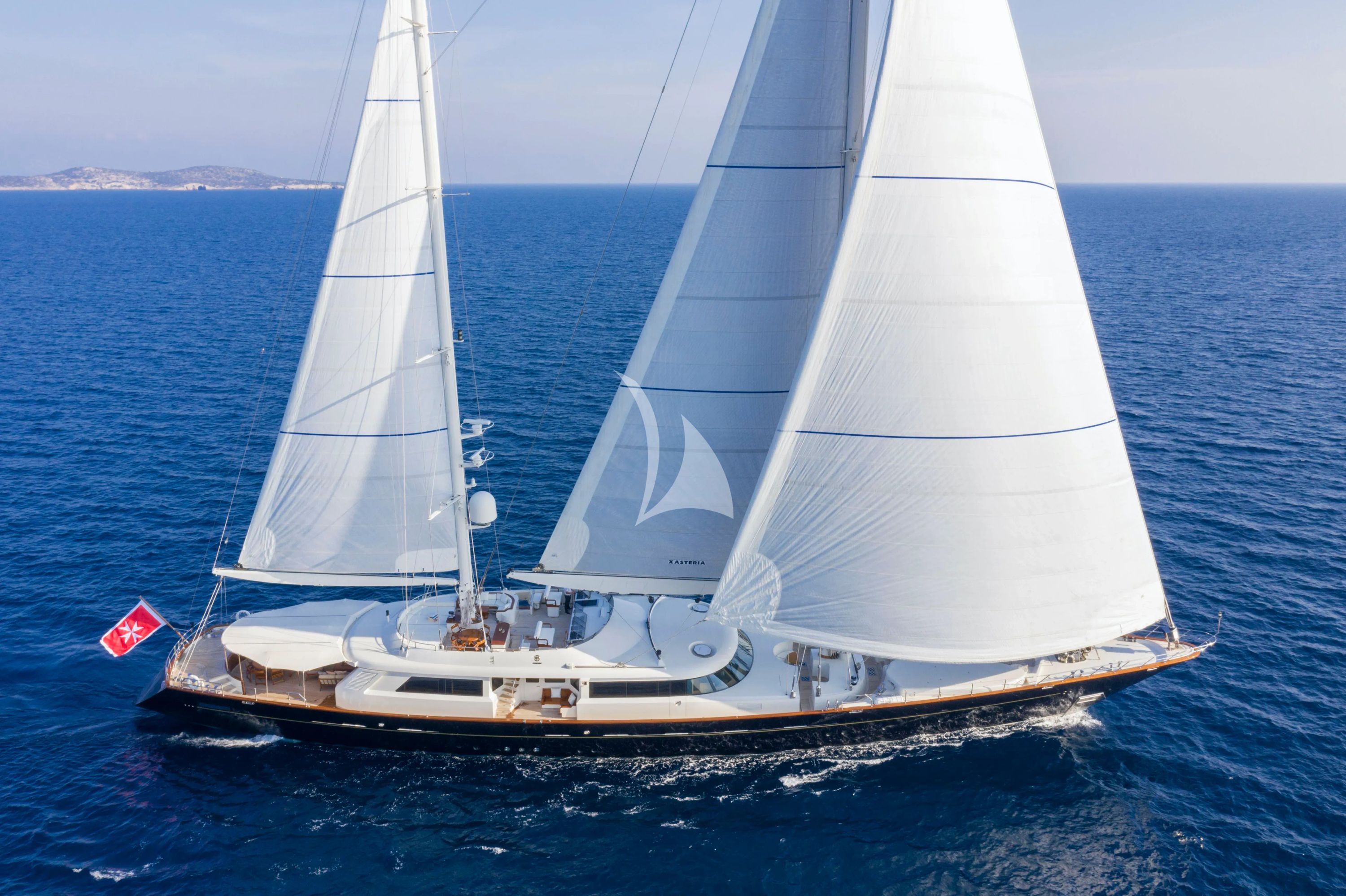 Experience the perfect harmony of sail and motor aboard XASTERIA, a distinguished 52-meter Perini Navi motor-sailer that epitomizes Italian craftsmanship and timeless elegance. Built in 1995 and comprehensively refitted in 2019, this exceptional yacht seamlessly blends classic design with contemporary luxury, offering discerning guests an unparalleled charter experience in the enchanting Greek Islands. XASTERIA accommodates up to 12 guests across five beautifully appointed staterooms, featuring three doubles and two twins with additional Pullman berths for flexible arrangements. Based at Marina Flisvos in Athens, she serves as your gateway to the crystalline waters and legendary beauty of the Greek archipelago, where ancient history meets modern sophistication at every anchorage. The yacht's impressive array of water toys ensures endless entertainment, from exhilarating SeaBob underwater adventures and electric Jetsurf sessions to wakeboarding and stand-up paddleboarding. Two custom-built 6-meter tenders, each accommodating six guests with powerful jet propulsion systems, provide seamless exploration of secluded coves and charming harbors. With her generous 4,500 nautical mile range and comfortable 13-knot cruising speed, XASTERIA offers the freedom to discover hidden gems throughout the Aegean and Ionian seas, while her steel displacement hull ensures a smooth, stable journey wherever your Mediterranean dreams may lead.