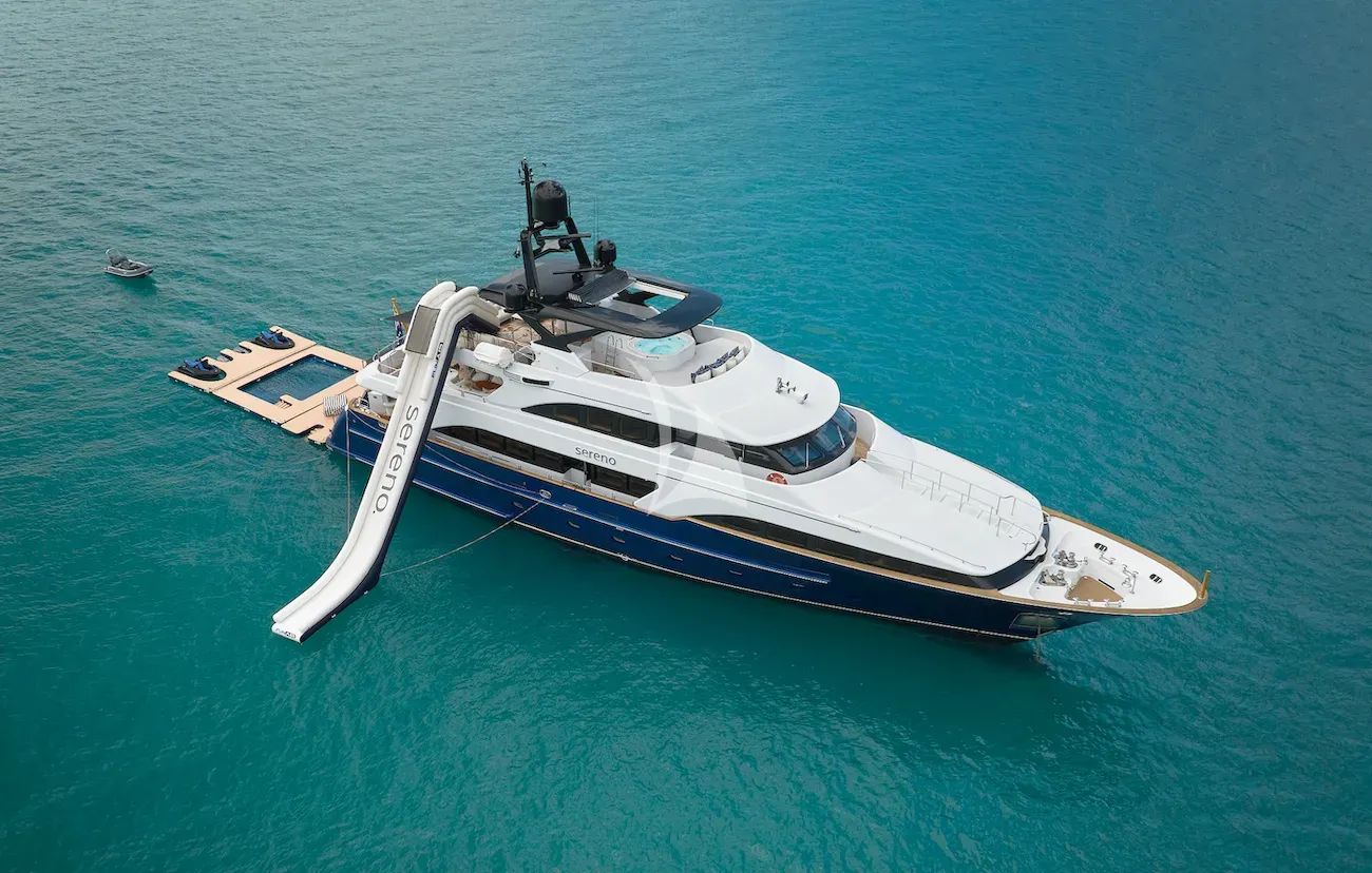 SERENO represents the perfect marriage of Italian craftsmanship and contemporary luxury, showcasing Benetti's renowned shipbuilding expertise in a meticulously maintained 35-meter yacht. Following her comprehensive 2024 refit, this stunning vessel offers an exceptional charter experience for up to 11 guests across five elegantly appointed cabins, including a spectacular full-beam master suite featuring his-and-her en-suite bathrooms and a private owner's dressing room. The thoughtfully designed interior by François Zuretti creates sophisticated living spaces that flow seamlessly between indoor and outdoor areas, while the tri-deck configuration maximizes both entertaining space and privacy. SERENO's impressive arsenal of water toys transforms every anchorage into a private adventure playground, featuring everything from high-speed Seabobs and jet skis to the thrilling 11.8-meter Intrepid tender capable of 60 knots, plus unique amenities like a floating golf hole and Fun Air inflatable slide. Based flexibly in the Western Mediterranean, SERENO offers extraordinary cruising opportunities from the glamorous French Riviera to the enchanting waters surrounding Sicily. With her efficient 3,800-nautical-mile range and stabilizers ensuring smooth sailing both underway and at anchor, combined with modern amenities including Starlink connectivity and outdoor cinema capabilities, SERENO delivers the ultimate Mediterranean charter experience where luxury meets adventure in perfect harmony.