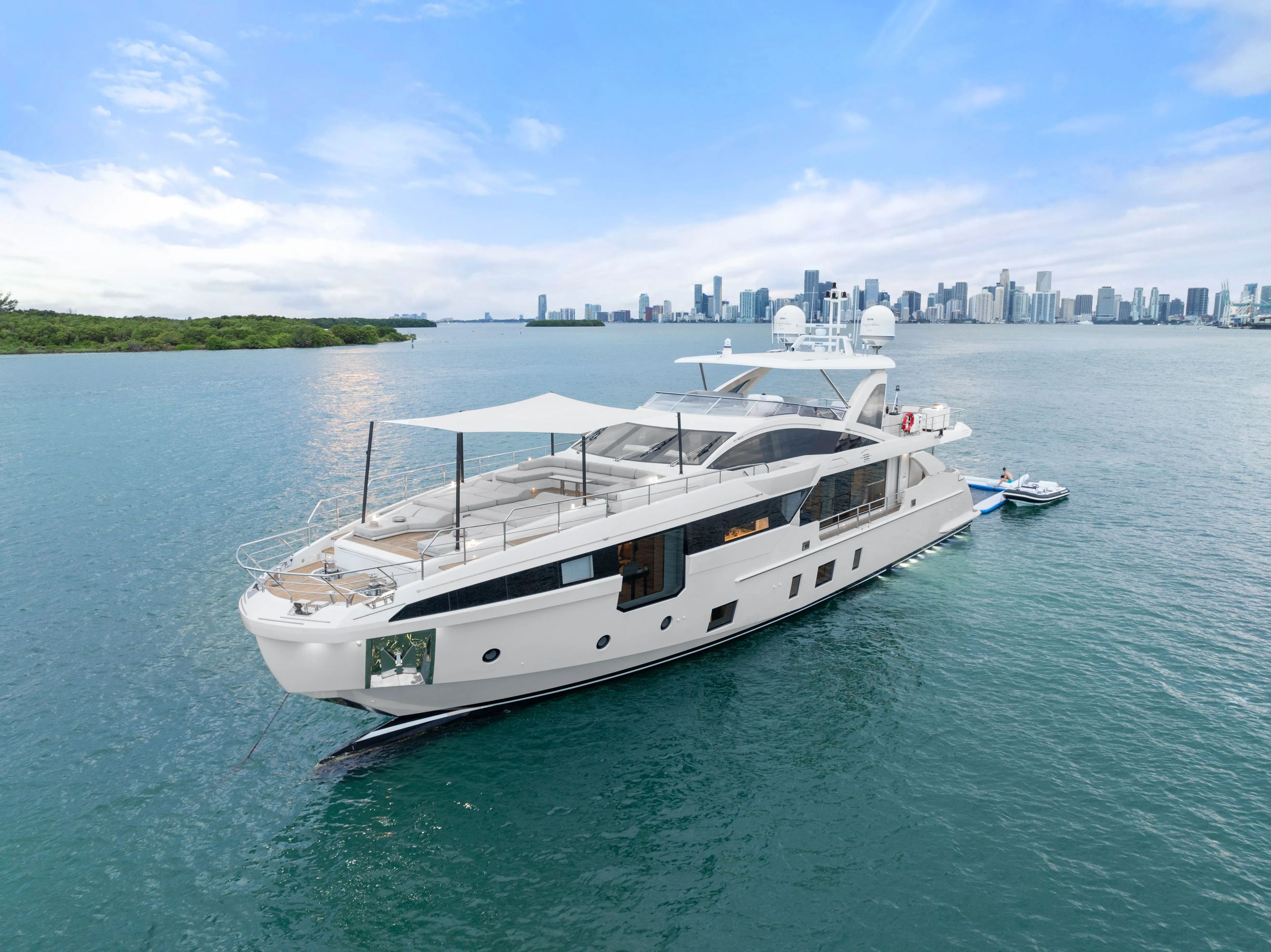 Experience the pinnacle of contemporary luxury aboard FREEDOME, a stunning 32-meter Azimut masterpiece launched in 2022. This exceptional charter yacht showcases the renowned naval architecture of Stefano Righini paired with the sophisticated interior design of Achille Salvagni, creating an atmosphere of refined elegance throughout her spacious flybridge configuration. Accommodating up to 11 guests across five beautifully appointed cabins, including three doubles and two twins, FREEDOME offers the perfect balance of intimacy and grandeur for discerning charter parties. The master suite exemplifies luxury living at sea, positioned on the main deck as a full-beam sanctuary with floor-to-ceiling windows that frame panoramic ocean views while flooding the space with natural light. Advanced stabilization systems ensure supreme comfort both underway and at anchor, while dynamic positioning technology allows for effortless positioning in pristine anchorages throughout the Florida Keys and Bahamas. FREEDOME truly distinguishes herself with an extraordinary collection of water toys that transforms every charter into an aquatic adventure. From the impressive 43-foot Midnight Express chase boat with quintuple Mercury engines to Seabobs, e-foils, and a three-seat SeaDoo Waverunner, guests enjoy unlimited options for exploration and excitement. The inflatable swimming pool with jellyfish netting creates a private oasis, while comprehensive snorkeling gear, kayaks, and towables ensure every guest finds their perfect water activity in the crystal-clear waters of the Caribbean's most coveted destinations.