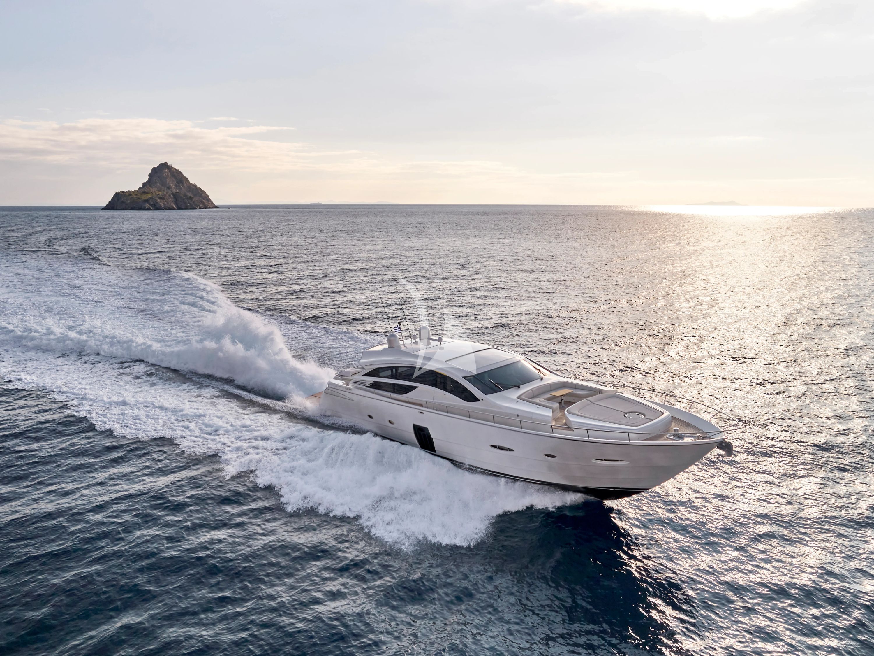 Experience the perfect fusion of Italian performance and sophisticated luxury aboard M/Y FOR EVER, a stunning 24.5-meter Pershing that epitomizes the art of high-speed cruising. Freshly refitted in 2023, this exceptional yacht showcases the masterful design of Fulvio de Simoni, delivering an exhilarating charter experience with her impressive 33-knot cruising speed and sleek planing hull configuration. Based year-round in Athens at Alimos Marina, FOR EVER offers privileged access to the legendary Greek islands, where azure waters and ancient coastlines create the perfect backdrop for unforgettable voyages. Accommodating up to 8 guests in four beautifully appointed cabins, including a master suite with panoramic hull windows and a VIP cabin, FOR EVER ensures comfort without compromising her dynamic performance capabilities. The yacht's open superstructure design maximizes natural light and creates seamless indoor-outdoor living, while modern amenities including 4/5G internet, outdoor entertainment systems, and comprehensive air conditioning enhance every moment aboard. Adventure seekers will delight in FOR EVER's extensive collection of water toys, featuring a Seabob for underwater exploration, SeaDoo jet ski, dual SUPs, waterski equipment for all skill levels, wakeboard, towables, and comprehensive fishing and snorkeling gear. Whether seeking adrenaline-fueled water sports or serene island-hopping through the Cyclades and beyond, this remarkable Pershing delivers an unparalleled charter experience that seamlessly blends Italian sophistication with the timeless allure of the Greek seas.