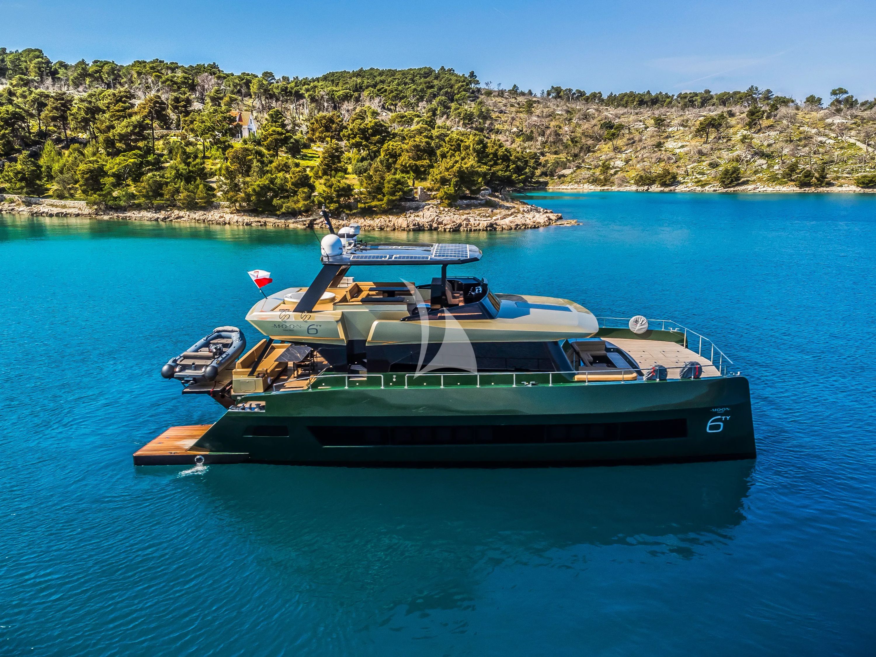Experience the pinnacle of catamaran luxury aboard OVER THE MOON, a stunning 19.33-meter vessel from Moon Yachts that redefined contemporary yacht design in 2023. This exceptional catamaran combines impressive beam width of 9.64 meters with thoughtful accommodation for eight guests across four beautifully appointed double cabins, including a master suite and VIP cabin. Each cabin features generous bed sizes up to 150x200cm and impressive ceiling heights up to 2.05 meters, ensuring supreme comfort throughout your Croatian adventure. Based year-round in the captivating port of Split, OVER THE MOON serves as your gateway to Croatia's legendary coastline and pristine islands. The yacht's shallow 1.65-meter draft opens up secluded bays and intimate anchorages that larger vessels simply cannot access, while her impressive 17-knot maximum speed ensures you can explore multiple destinations with ease. The flybridge design maximizes outdoor living spaces, perfect for taking in the Adriatic's breathtaking scenery. Adventure enthusiasts will revel in OVER THE MOON's extraordinary water toy collection, featuring two cutting-edge SeaBob F5 underwater scooters, an exhilarating E-foil, two SUPs, and comprehensive snorkeling equipment. Whether you're gliding beneath the surface with a SeaBob or soaring above the waves on the E-foil, every moment promises unforgettable thrills. Modern conveniences including comprehensive air conditioning, WiFi connectivity, and entertainment systems throughout ensure your charter experience seamlessly blends luxury with adventure.