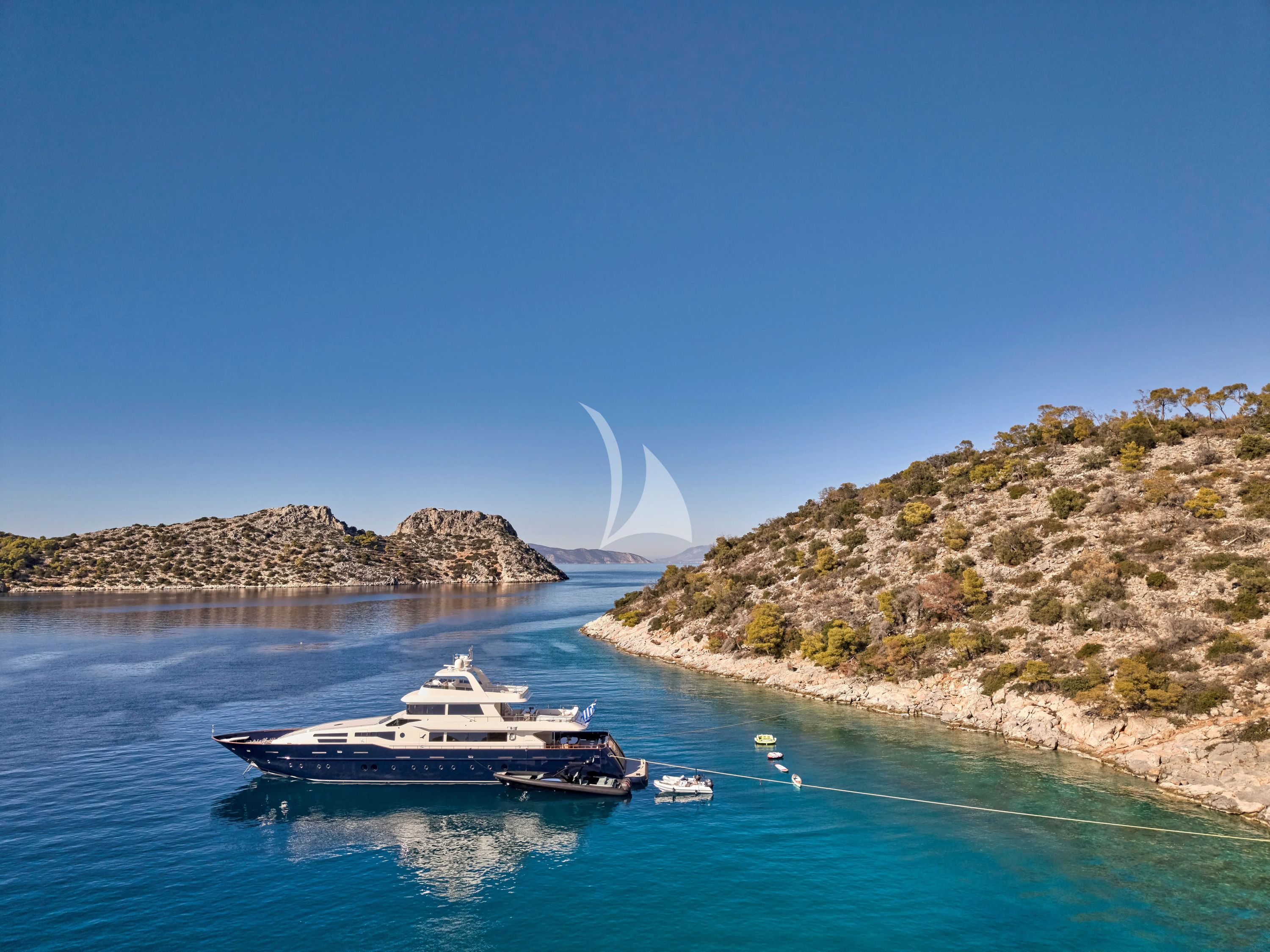 Discover the refined elegance of CONDOR A, a stunning 42.4-meter Tecnomar motor yacht that seamlessly blends contemporary sophistication with exceptional performance. Following her comprehensive 2024-2025 refit, this impressive tri-deck vessel showcases a completely transformed upper deck featuring a brand new salon and extended exterior dining area, plus an additional sundeck with flybridge and sunbeds. These thoughtful enhancements create the perfect platform for unforgettable Mediterranean adventures, accommodating up to 10 guests in supreme comfort. CONDOR A's five beautifully appointed cabins include a full-beam master suite with king-size bed and his-and-hers ensuite facilities, complemented by two additional double cabins and two twin cabins, all featuring private bathrooms. The yacht's planing hull design delivers an exhilarating cruising speed of 19 knots, while her impressive array of water toys ensures endless entertainment possibilities. From the 4.95-meter Grand tender and inflatable kayak to waterskis, diving equipment, and towables, every guest can indulge their aquatic passions. Based year-round in Athens with access to the spectacular Greek islands, CONDOR A offers the ideal gateway to explore pristine beaches, charming villages, and crystalline waters of the Mediterranean. Her professional crew, modern amenities including 5G internet connectivity, and comprehensive stabilization systems ensure a flawless charter experience that exceeds the expectations of the most discerning travelers seeking luxury, adventure, and authentic Greek hospitality.