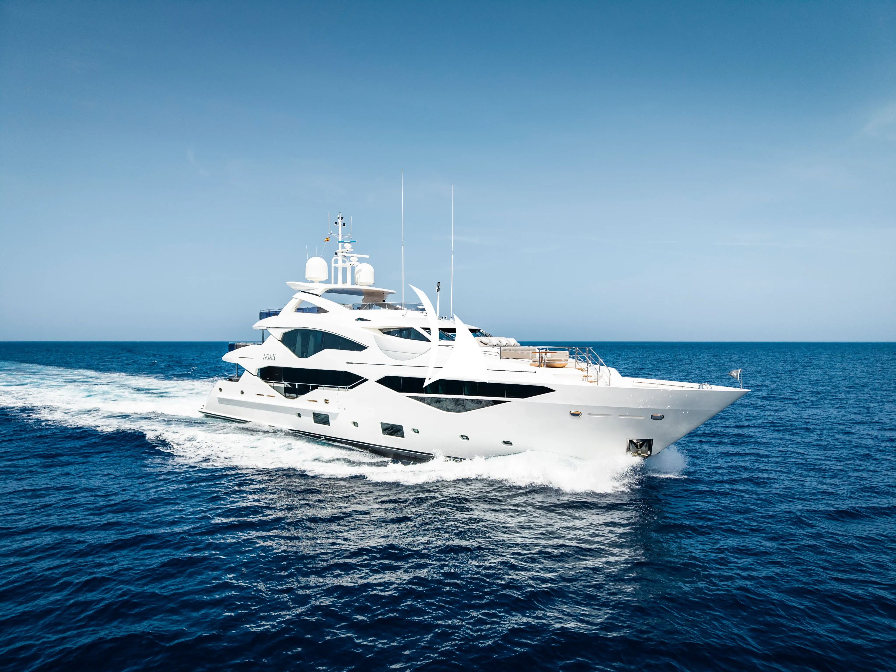 Immaculately presented and freshly enhanced through an extensive 2025 refit, the 40.1-meter Sunseeker NOAH represents the pinnacle of contemporary charter excellence in the Mediterranean. This sophisticated tri-deck motor yacht seamlessly blends British craftsmanship with modern luxury, offering an exceptional platform for discerning guests seeking the ultimate yachting experience across the pristine waters of the West Mediterranean. NOAH's thoughtfully designed accommodation welcomes up to 10 guests across five beautifully appointed cabins, including a spectacular full-beam master suite featuring a super king-sized bed and luxurious en-suite facilities with both bath and shower. The yacht's impressive collection of water toys transforms every anchorage into an aquatic playground, featuring brand-new twin jetskis, SeaBobs, a Fliteboard, multiple paddleboards, and an exhilarating 5.5-meter inflatable slide launching directly from the bow. The professional tender service is provided by a pristine 6.2-meter Ribeye with 200HP Yamaha engine, ensuring seamless exploration of secluded coves and vibrant coastal destinations. Based in the prestigious port of Palma, NOAH offers unparalleled access to the Mediterranean's most coveted cruising grounds, with summer 2026 itineraries spanning the enchanting Turkish coast through the legendary Greek islands. Advanced stabilization systems ensure supreme comfort both underway and at anchor, while comprehensive entertainment systems and modern connectivity keep guests perfectly connected to their floating sanctuary.