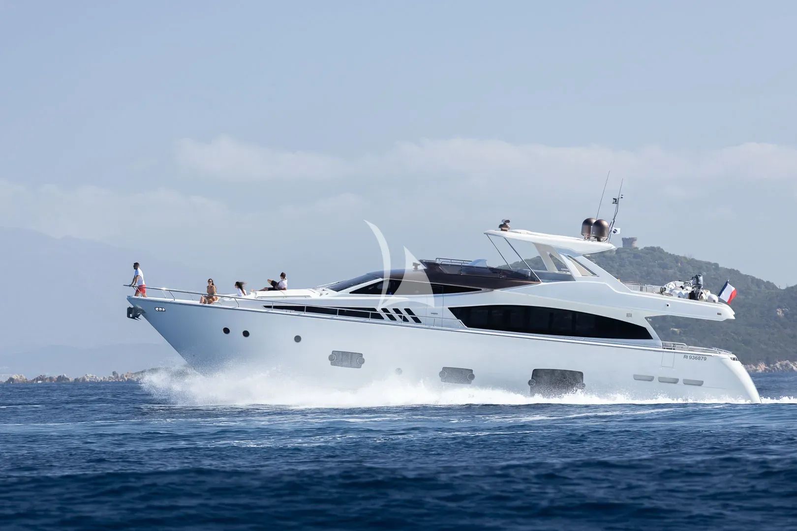 Experience the perfect blend of Italian craftsmanship and Mediterranean adventure aboard BIZMAN, a stunning 24.79-meter Ferretti motor yacht that epitomizes luxury charter excellence. Built in 2016 and meticulously maintained with recent refits in 2020 and 2022, this sophisticated vessel offers an impeccable platform for exploring the breathtaking waters of Corsica from her base in Ajaccio. BIZMAN accommodates up to eight guests in four elegantly appointed cabins, including three doubles and one twin, each featuring entertainment systems and luxurious amenities. The yacht's impressive flybridge configuration maximizes both indoor and outdoor living spaces, while advanced stabilization systems ensure supreme comfort whether cruising at her spirited 23-knot cruising speed or anchored in secluded Mediterranean coves. What truly sets BIZMAN apart is her exceptional collection of water toys and equipment, featuring cutting-edge options like Efoil and Fliteboard for the adventurous, dual Seabobs and Sea scooters for underwater exploration, plus traditional favorites including waterskis, wakeboard, and towables. A jetski, comprehensive fishing and snorkeling gear, and an inflatable swimming platform complete the aquatic arsenal. With comprehensive entertainment systems, climate control throughout, and reliable communication capabilities, BIZMAN delivers the ultimate charter experience for discerning guests seeking to discover Corsica's pristine coastlines and crystal-clear waters in uncompromising style and comfort.