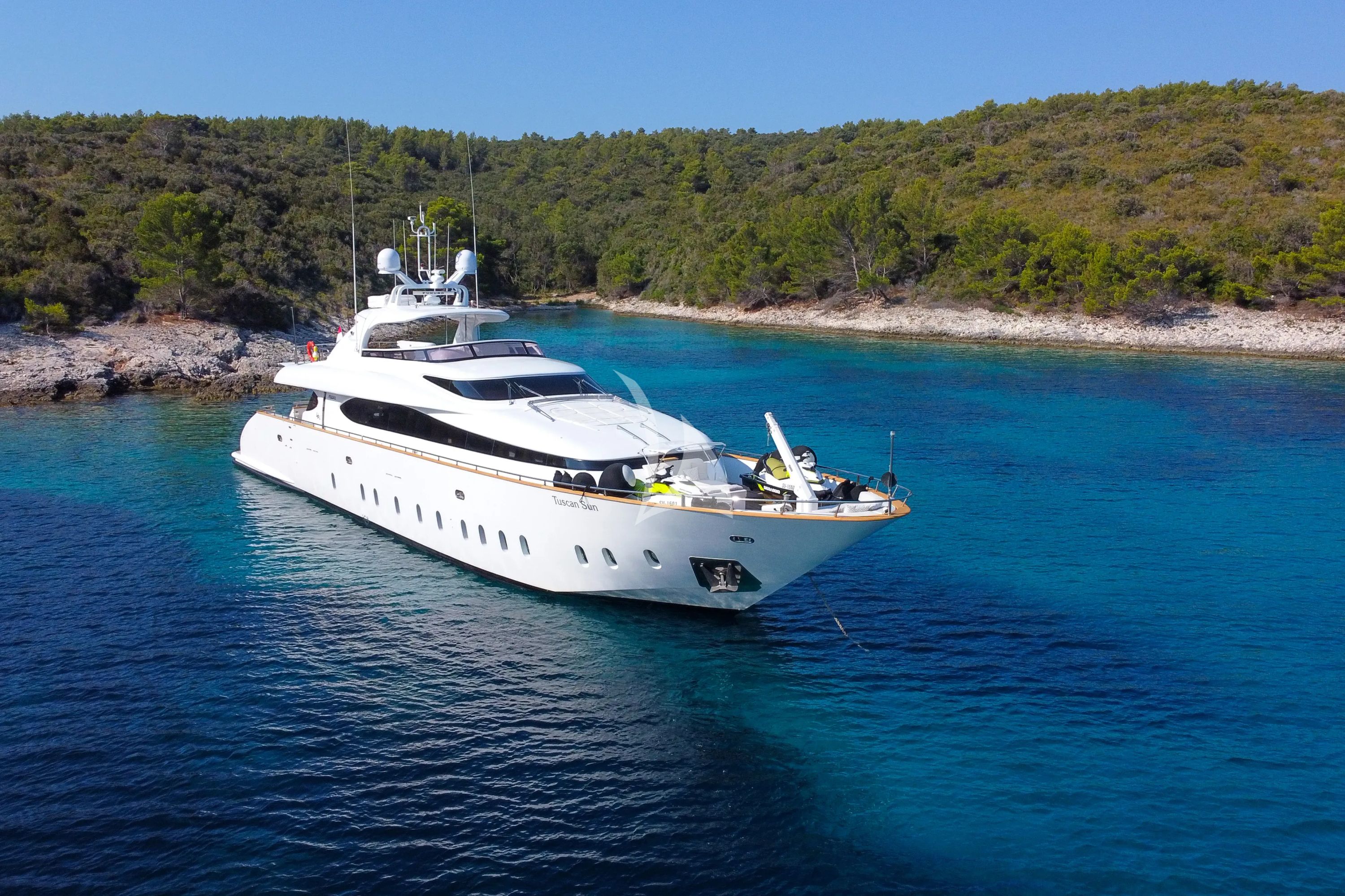 Step aboard TUSCAN SUN, a magnificent 32.5-meter Maiora masterpiece that epitomizes contemporary luxury on the Adriatic. This stunning motor yacht, freshly enhanced through a comprehensive 2021 refit, combines Italian craftsmanship with Croatian coastal elegance to deliver an unparalleled charter experience. Accommodating up to 10 guests across five beautifully appointed cabins, including three doubles and two twins, TUSCAN SUN offers the perfect blend of spacious luxury and intimate sophistication for discerning travelers. Based in the prestigious Marina Kaštela near Split, this exceptional vessel provides seamless access to Croatia's most coveted destinations along the Dalmatian coast. Her impressive cruising speed of 23 knots ensures effortless island-hopping adventures, while advanced stabilization systems guarantee supreme comfort both underway and at anchor. The yacht's extensive water toy collection transforms every anchorage into a private aquatic playground, featuring SeaDoo jet skis, a SeaBob F5, paddleboards, wakeboards, water skis, and comprehensive snorkeling equipment—complemented by a fleet of over 25 wetsuits ensuring every guest is perfectly equipped for water adventures. Roberto del Re's inspired interior design creates an atmosphere of refined elegance throughout, while the flybridge configuration maximizes outdoor entertaining spaces. With unlimited high-speed WiFi, satellite television, and cutting-edge entertainment systems, TUSCAN SUN seamlessly blends luxury relaxation with modern connectivity, making her the ideal choice for exploring Croatia's pristine waters in absolute style and comfort.