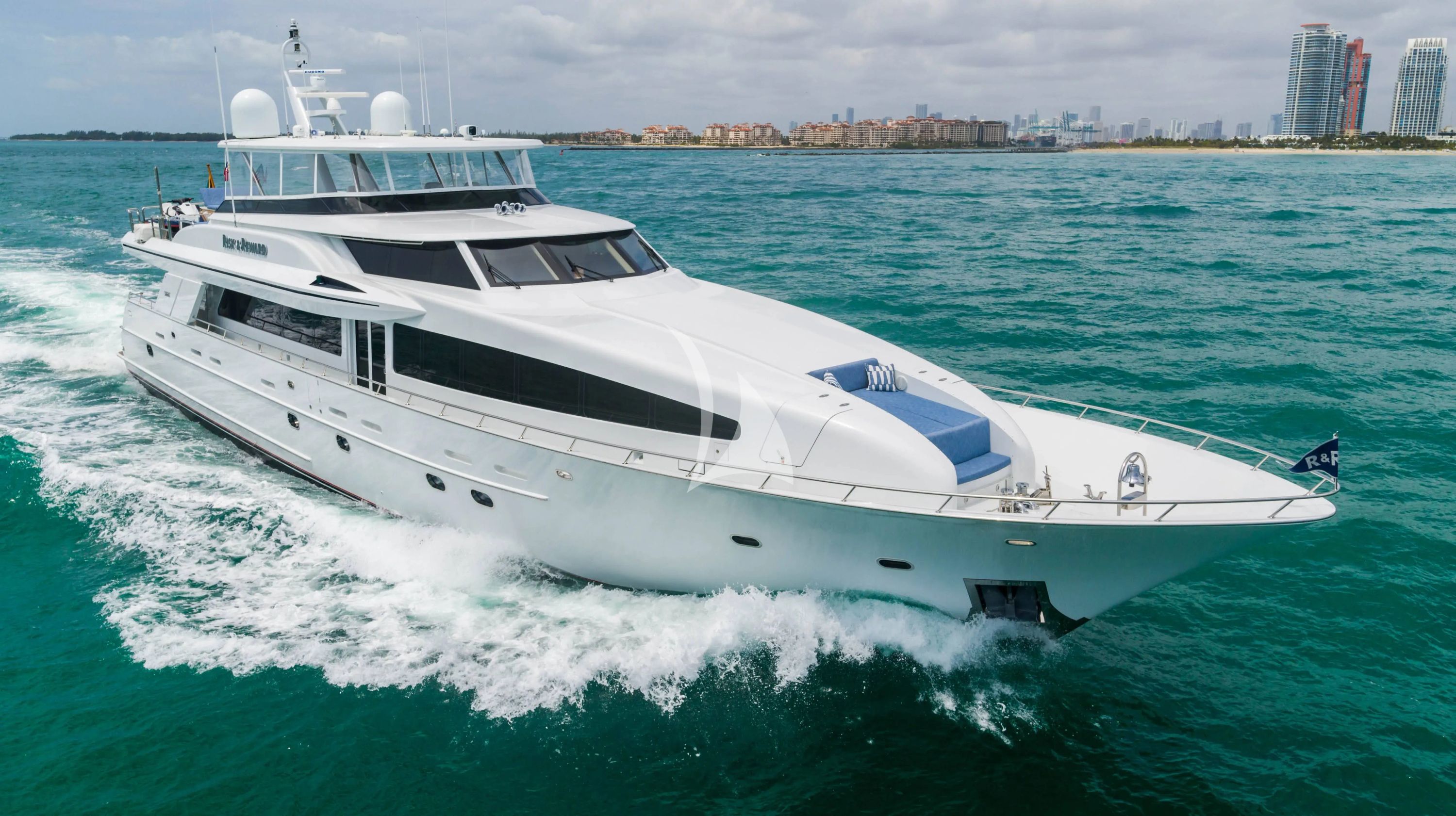Experience the perfect balance of adventure and luxury aboard RISK & REWARD, a sophisticated 120-foot Crescent yacht that redefines charter excellence from her Fort Lauderdale base. Following her comprehensive 2022 refit, this semi-displacement beauty combines elegant design by Robin Rose with Jack Sarin's proven naval architecture, creating an ideal platform for discerning guests seeking both comfort and excitement on the water. RISK & REWARD accommodates up to nine guests in four thoughtfully appointed staterooms, including a spacious forward master suite with king berth and expansive ensuite, complemented by two queen guest cabins and one twin configuration. Her 21-knot maximum speed and impressive 3,300-nautical-mile range open endless possibilities for extended cruising adventures throughout the Caribbean and Bahamas. The yacht's extraordinary toy collection transforms every charter into an aquatic playground. Guests enjoy the fully-equipped 39-foot HCB center console with triple 350hp engines for serious sportfishing expeditions, dual Yamaha WaveRunners, SeaBobs for underwater exploration, and an E-Foil for the ultimate surface experience. The extensive selection includes a waterslide, inflatable swim platform, wakeboarding equipment, and floating loungers, while the impressive 7x7 inflatable dock creates the perfect staging area. With advanced stabilization systems ensuring comfort underway and at anchor, plus Starlink connectivity keeping you connected to the world, RISK & REWARD delivers an uncompromising charter experience where luxury meets limitless adventure.