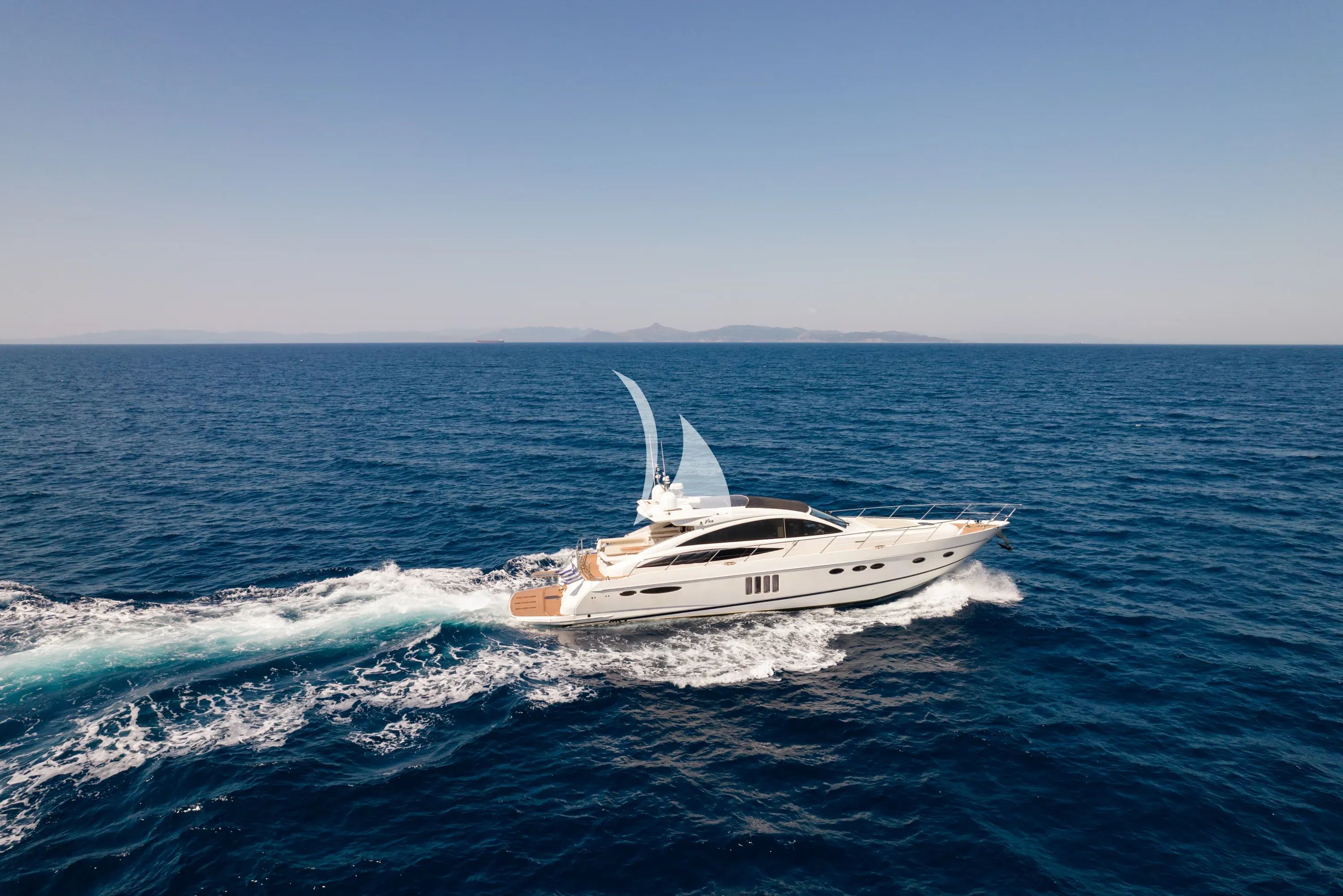 Experience the perfect blend of performance and luxury aboard MOJO, a stunning 20-meter Princess yacht that exemplifies refined cruising in the Greek islands. Recently refreshed in 2023 with meticulous attention to detail, including pristine new teak decking and comprehensive mechanical upgrades, this sleek motor yacht delivers an impeccable charter experience for discerning guests seeking both comfort and adventure. MOJO's thoughtfully designed layout accommodates up to four guests in two elegant en-suite cabins on the lower deck, featuring a master suite and VIP suite, each appointed with sumptuous double beds and private facilities. The yacht's impressive planing hull configuration enables exhilarating cruising speeds of 25 knots, with a thrilling maximum speed of 34 knots, making island-hopping throughout the Aegean an effortless pleasure. For those who crave aquatic adventures, MOJO delivers an exceptional array of water toys including sea scooters, paddleboards, waterskis, wakeboard, and comprehensive snorkeling equipment. The 3.6-meter Yamaha tender ensures seamless shore access to secluded beaches and charming coastal villages. Based year-round in Athens, MOJO offers unparalleled access to Greece's most coveted destinations, from the cosmopolitan allure of Mykonos and Santorini to the pristine waters surrounding lesser-known gems of the Cyclades and Saronic Gulf.