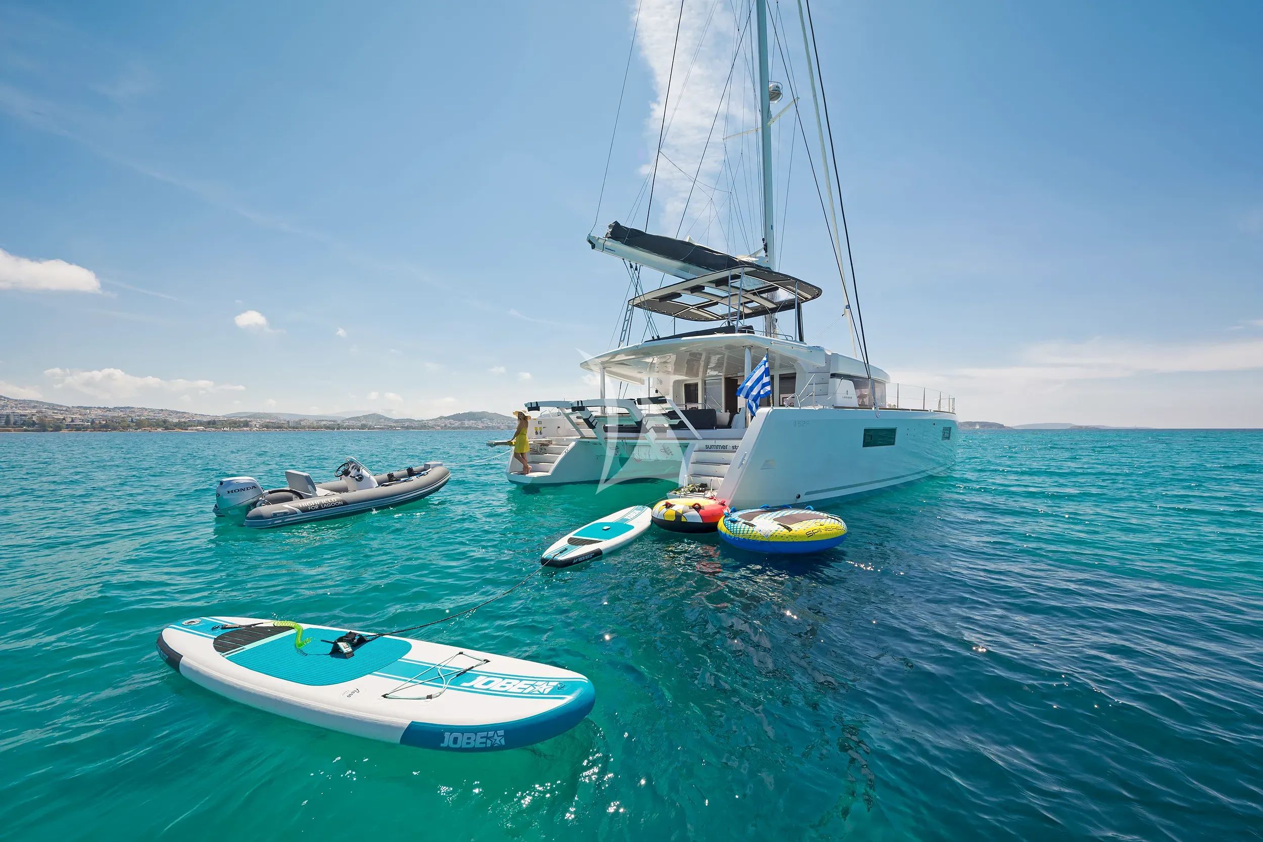 Discover the perfect harmony of space, comfort, and adventure aboard Summer Star, a stunning 2019 Lagoon catamaran that redefines luxury charter experiences in the Greek islands. This exceptional 15.84-meter vessel combines the renowned stability and spaciousness of a modern catamaran design with sophisticated amenities, creating an ideal platform for unforgettable Mediterranean escapes. Summer Star's intelligently designed layout accommodates up to 10 guests across five beautifully appointed double cabins, each featuring air conditioning and private en-suite facilities. The generous beam of 8.74 meters ensures remarkable living spaces both above and below deck, while the shallow 1.55-meter draft opens access to secluded coves and pristine beaches that larger vessels simply cannot reach. The flybridge superstructure provides elevated entertaining areas with panoramic views, perfect for sunset cocktails and al fresco dining. Adventure enthusiasts will delight in Summer Star's impressive collection of water toys, including sea scooters, paddleboards, wakeboard, water skis, sailing dinghy, and snorkeling equipment, plus entertaining options like a banana boat and tube for endless fun on the water. The professional-grade Highfield tender with Honda outboard ensures seamless shore excursions and water sports activities. Based in Athens with flexibility to explore alternative ports upon request, Summer Star offers the freedom to discover Greece's most captivating destinations while enjoying the comfort and luxury that discerning charter guests expect.