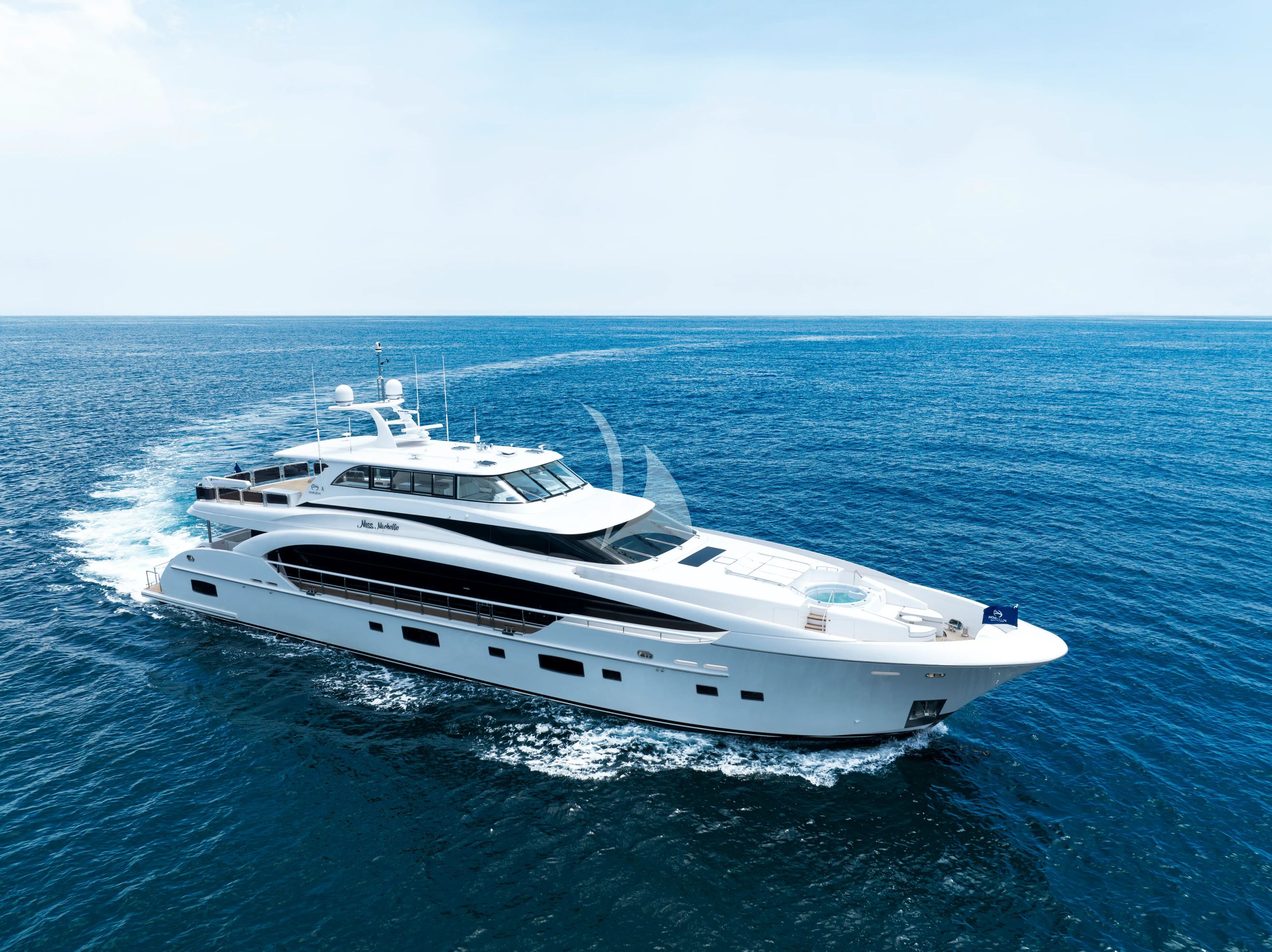 Experience the pinnacle of modern luxury aboard MISS MICHELLE, a stunning 122-foot Horizon yacht that redefines charter excellence in 2025. This magnificent displacement yacht combines sophisticated design with exceptional performance, featuring a distinctive raised pilot-house superstructure and the coveted new-build advantage of cutting-edge technology and pristine condition. MISS MICHELLE accommodates eight guests in supreme comfort across four elegantly appointed double staterooms. The impressive main deck owner's suite commands attention with its forward-facing king bed and spa-like ensuite featuring double vanities, separate shower, and private toilet enclosure. Below deck, three additional guest staterooms include a spectacular full-beam VIP suite that rivals the master accommodation, ensuring every guest enjoys five-star comfort throughout their journey. The yacht's extraordinary water sports arsenal transforms every anchorage into an aquatic playground. Charter guests command their own fleet including a remarkable 33-foot Mag Bay center console chase boat, three GPS-tracked WaveRunners, dual Seabobs for underwater exploration, and a 15-foot Williams jet tender. Advanced stabilization systems ensure smooth cruising and peaceful nights at anchor, while comprehensive entertainment systems featuring 4/5G connectivity and outdoor cinema create the perfect ambiance for both adventure and relaxation. Based year-round in Florida with seamless access to the pristine waters of the Bahamas, MISS MICHELLE offers the ultimate charter experience where luxury meets limitless exploration.