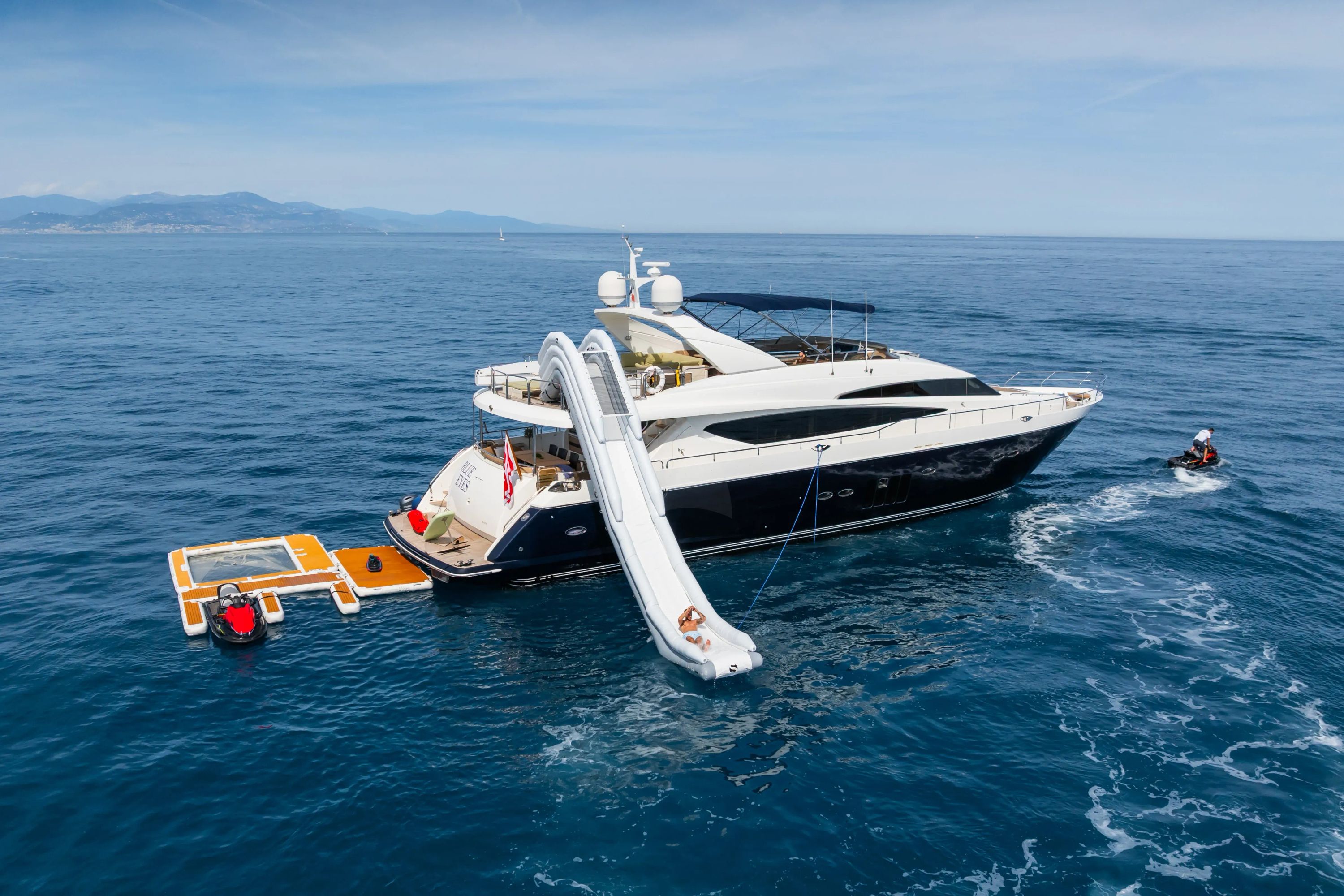 Discover the perfect blend of elegance and adventure aboard BLUE EYES, a stunning 29.42-meter Princess yacht that epitomizes the Mediterranean charter experience. Freshly enhanced with a comprehensive 2024 refit, this sophisticated vessel offers an impeccable platform for exploring the glamorous French Riviera, enchanting Corsica, pristine Sardinia, and Italy's captivating coastlines from her prime bases in Antibes and Cannes. Thoughtfully designed to accommodate up to eight guests across four beautifully appointed cabins, including a spacious master suite with a king-size bed, BLUE EYES delivers both comfort and flexibility for discerning charter parties. The yacht's impressive flybridge configuration maximizes outdoor living spaces, while advanced stabilization systems ensure smooth cruising at her comfortable 16-knot cruising speed, with the capability to reach 22 knots when adventure calls. What truly sets BLUE EYES apart is her exceptional collection of water toys and amenities. From two brand-new 2024 Kawasaki jet skis and cutting-edge eFoil technology to Seabobs, paddleboards, and an innovative anti-jellyfish inflatable pool, every moment on the water becomes an opportunity for excitement. The floating platforms create the perfect staging area for aquatic adventures, while the comprehensive entertainment systems, including Starlink connectivity throughout, ensure guests remain connected to both the ocean and the world beyond. This is Mediterranean yachting at its finest.