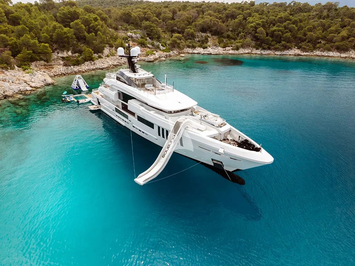 Experience the epitome of tranquil luxury aboard OURANOS, the distinguished 49.9-meter Admiral yacht that earned recognition from RINA Classification Society as the "most silent yacht ever certified" in her class. This exceptional tri-deck displacement yacht, fresh from her comprehensive 2024 refit, offers an unparalleled charter experience where serenity meets sophistication in the stunning waters of the Greek Isles. OURANOS accommodates up to 12 guests across six beautifully appointed cabins featuring timeless design by Gianmarco Campanino, seamlessly blending practicality with refined elegance. The yacht's crown jewel is her newly renovated beach club, complete with a fully equipped Technogym fitness center featuring Peloton bikes, pilates accessories, and professional weight training equipment, alongside a luxurious plunge pool with Jacuzzi-style jets for the ultimate wellness retreat at sea. Adventure enthusiasts will revel in OURANOS' impressive collection of water toys, including three jet skis, three Seabobs with video recording capability, and the remarkable Technohull EXPLORER 40 RIB tender powered by twin Mercury 400HP engines. Based year-round at Flisvos Marina in Athens, this magnificent vessel provides the perfect platform to explore Greece's legendary coastline, ancient islands, and crystal-clear waters while enjoying whisper-quiet cruising at 12.5 knots and an impressive 2,000-nautical-mile range for extended Mediterranean adventures.