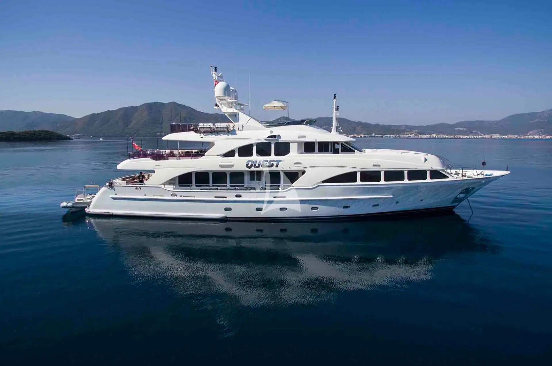 QUEST R presents an exceptional charter opportunity aboard a distinguished 37-meter Benetti, where Italian craftsmanship meets contemporary luxury. Built in 2008 and comprehensively refitted in 2018, this tri-deck displacement yacht showcases the renowned naval architecture of Stefano Righini and the sophisticated interior styling of Kate Bingham Interior Design. Her elegant proportions and impeccable finish create an atmosphere of understated luxury perfect for discerning charter guests. Accommodating up to 12 guests across five beautifully appointed cabins, including three doubles and two twins, QUEST R offers exceptional comfort and privacy. The yacht's impressive collection of water toys transforms any anchorage into an aquatic playground, featuring everything from Seabobs and jet skis to paddleboards, canoes, and thrilling towables like banana boats and ringos. The impressive 11-meter RIBco tender with twin 300hp engines serves as the perfect chase boat for water sports adventures, while comprehensive diving and snorkeling equipment opens up underwater exploration opportunities. Operating from her base in Marmaris, QUEST R offers unforgettable charter experiences throughout the pristine waters of Greece, Croatia, and Montenegro, with extended charters to Italy also available. Advanced amenities including underway and at-anchor stabilizers ensure smooth cruising, while Starlink connectivity and comprehensive entertainment systems keep guests connected and entertained throughout their Mediterranean odyssey.