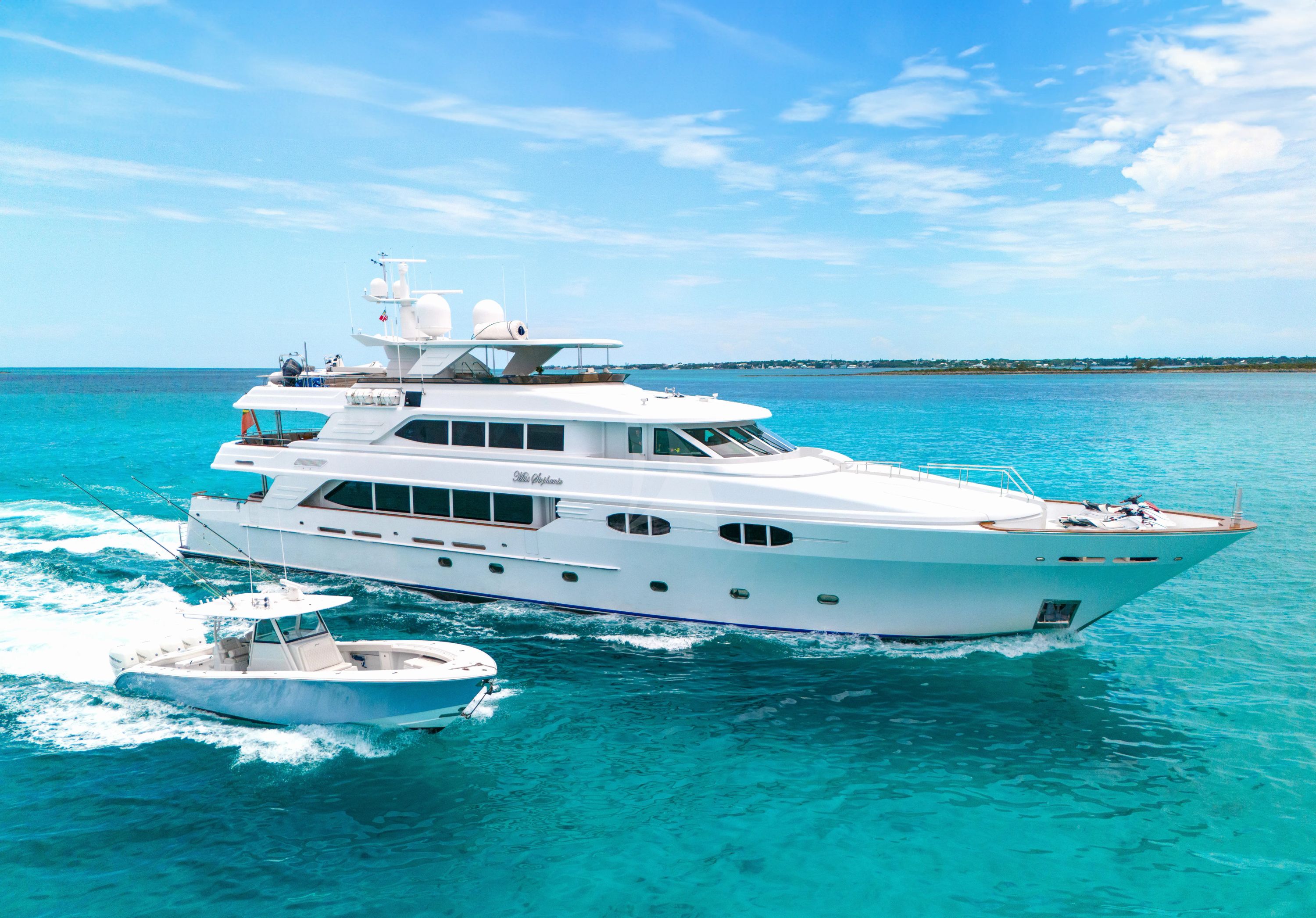Experience the ultimate Caribbean adventure aboard MISS STEPHANIE, a magnificently appointed 42-meter Richmond motor yacht that seamlessly blends luxury cruising with unparalleled on-water recreation. Following her comprehensive 2023 refit, this sophisticated vessel showcases refreshed interiors by Pavlik Design Team, accommodating 12 guests across six beautifully appointed staterooms, including an impressive on-deck owner's suite and bridge deck VIP cabin. What truly sets MISS STEPHANIE apart is her extraordinary collection of water toys and tenders, transforming every charter into an aquatic playground. The impressive fleet includes a 39-foot Yellowfin center console rigged for serious sportfishing, multiple jet skis including the latest Yamaha and Sea-Doo models, F5 SeaBobs for underwater exploration, and the spectacular 41-foot inflatable beach club complete with shaded cabana, netted pool, and jet ski docks. This floating beach club creates an exclusive waterfront resort experience wherever you drop anchor. Based in Nassau during summer months and operating throughout the Caribbean from December through March, MISS STEPHANIE offers exceptional access to the region's most coveted destinations. With her 12-knot cruising speed, 1,800-nautical-mile range, and advanced stabilization systems, she delivers smooth, comfortable passages between pristine beaches, vibrant coral reefs, and secluded anchorages. Modern amenities including Starlink connectivity, comprehensive entertainment systems, and professional-grade fishing equipment ensure every moment aboard exceeds expectations.