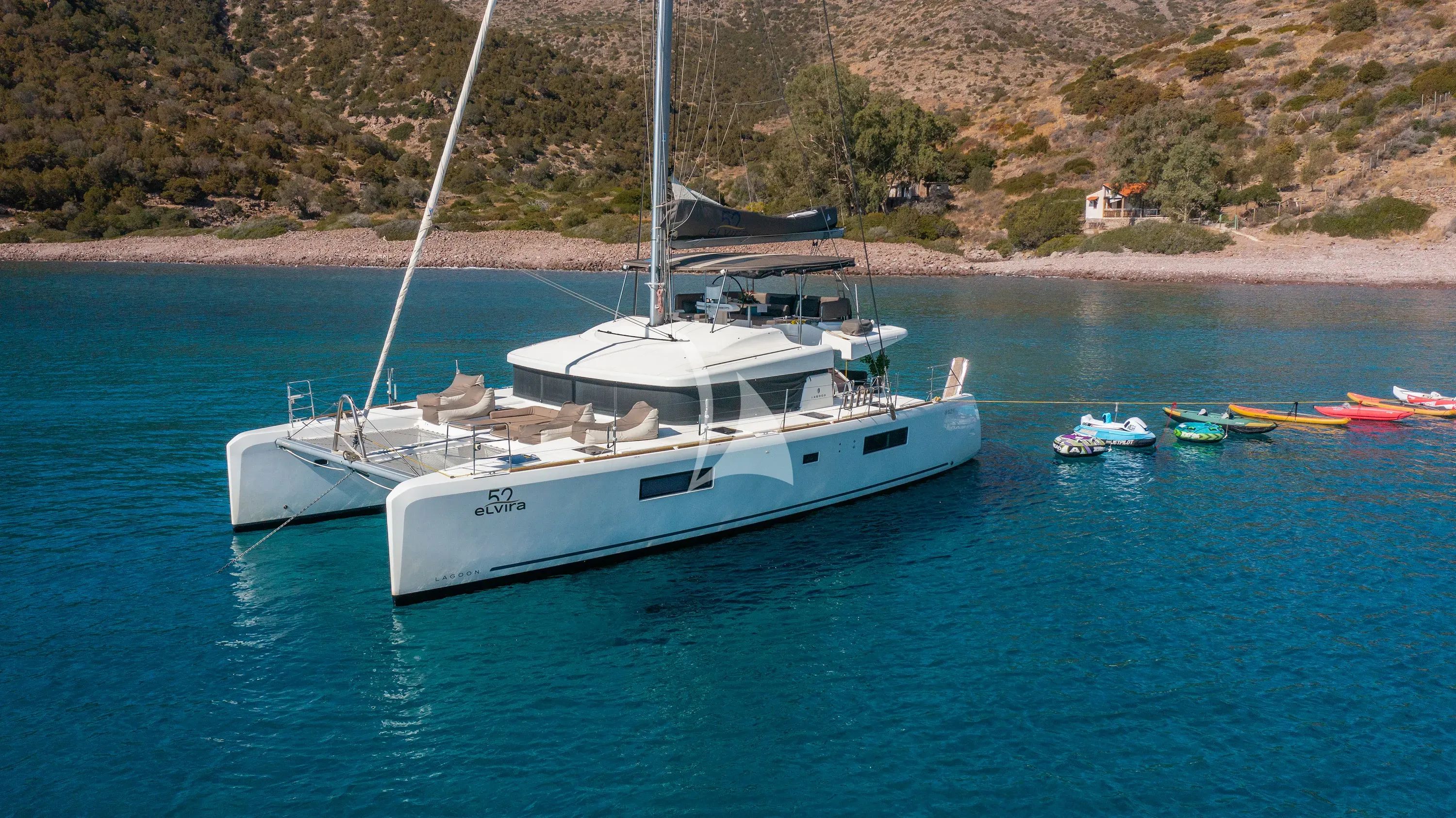 Step aboard ELVIRA 52, a stunning 2019 Lagoon catamaran that epitomizes contemporary luxury and stability on the azure waters of the Greek archipelago. This impressive 15.85-meter multi-hull vessel, recently refreshed in 2024, offers an unparalleled charter experience with her spacious flybridge design and exceptional beam of 8.62 meters, creating expansive living areas that rival much larger yachts. Her shallow 1.25-meter draft opens up secluded anchorages and pristine beaches that deeper-hulled vessels simply cannot reach. Accommodating up to 10 guests across five beautifully appointed VIP cabins, each featuring private facilities, full air conditioning, and 24-inch smart TVs, ELVIRA 52 ensures every guest enjoys equal luxury and privacy. The catamaran's stable platform and generous social spaces make her ideal for families and groups seeking both adventure and relaxation in the Greek islands. Adventure enthusiasts will delight in ELVIRA 52's impressive array of water toys, including dual sea scooters, stand-up paddleboards, kayak, adult and children's water skis, wakeboard, towable tubes, and comprehensive snorkeling and fishing equipment. Based year-round at Alimos Marina in Athens, she provides seamless access to the Cyclades, Saronic Gulf, and beyond. Whether exploring hidden coves, diving into crystal-clear waters, or simply savoring sundowners on her expansive deck spaces, ELVIRA 52 delivers an authentic Greek island experience wrapped in modern comfort and style.