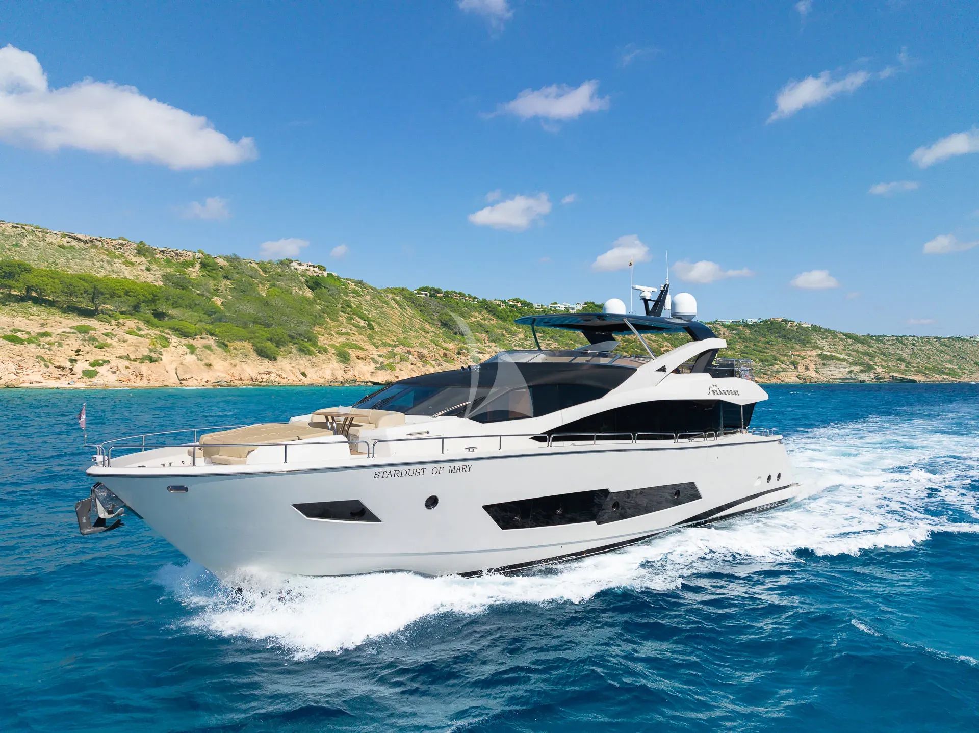 Experience the perfect fusion of British craftsmanship and Mediterranean elegance aboard STARDUST OF MARY, a stunning 26.3-meter Sunseeker that epitomizes modern yacht charter luxury. Fresh from her comprehensive 2023 refit, this impeccable motor yacht delivers an exceptional charter experience for up to eight guests across four beautifully appointed en-suite cabins, including a master stateroom, VIP cabin, and two flexible twin cabins that convert to doubles. STARDUST OF MARY transforms every charter into an adventure playground with her impressive collection of water toys. From the cutting-edge E-Foil and Seabob to paddleboards and thrilling towables, guests can explore the crystal-clear Mediterranean waters in style. The 2023 Williams Turbojet tender ensures seamless shore excursions, while water skiing and comprehensive snorkeling gear complete the aquatic arsenal. Based in the prestigious Palma de Mallorca from June through September, this exceptional yacht provides the perfect gateway to explore the enchanting Balearic Islands. With her impressive 28-knot top speed and advanced stabilization systems, STARDUST OF MARY delivers both exhilarating performance and supreme comfort at anchor. The yacht's sophisticated entertainment systems, including WiFi connectivity and comprehensive audio-visual equipment throughout, ensure guests remain connected while savoring the ultimate Mediterranean escape in unparalleled luxury and style.